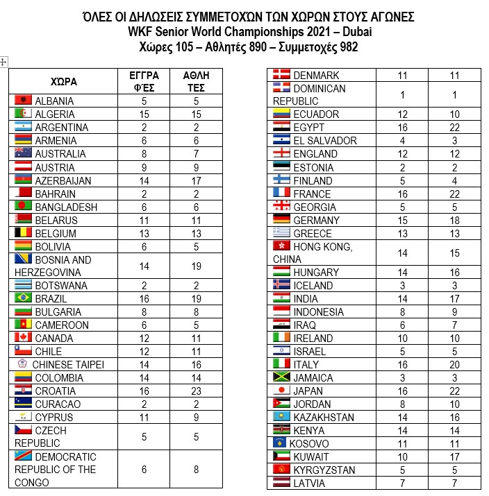 Κατωτέρω βλέπετε τις συμμετοχές των χωρών με τους αθλητές τους: