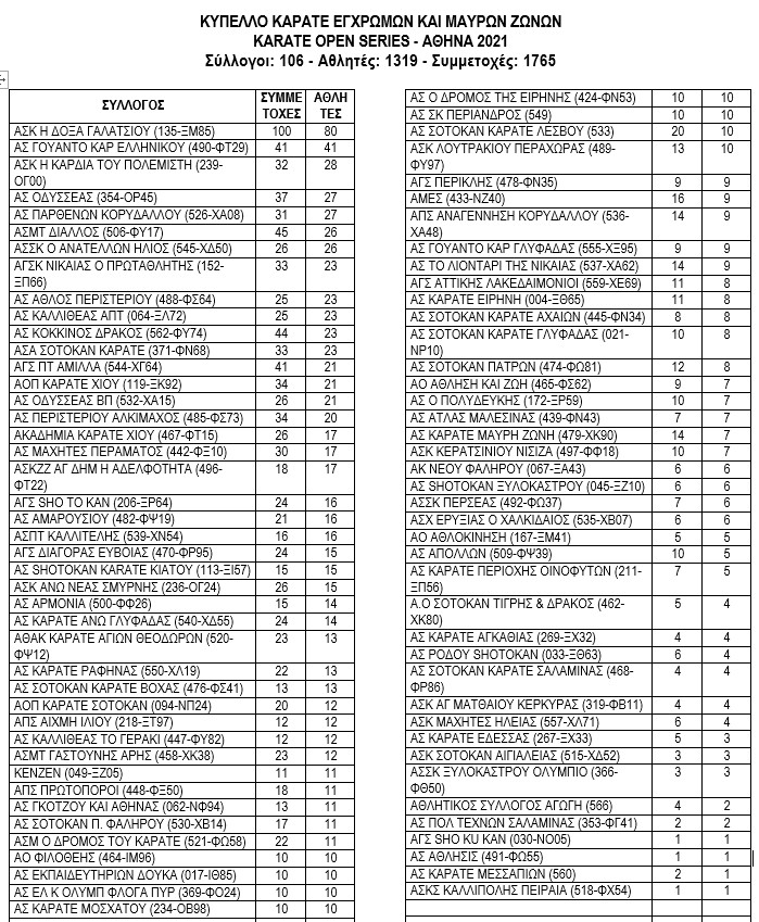 Οι συμμετοχές των αθλητών ταξινομημένες κατά πλήθος αθλητών των συλλόγων στους αγώνες: