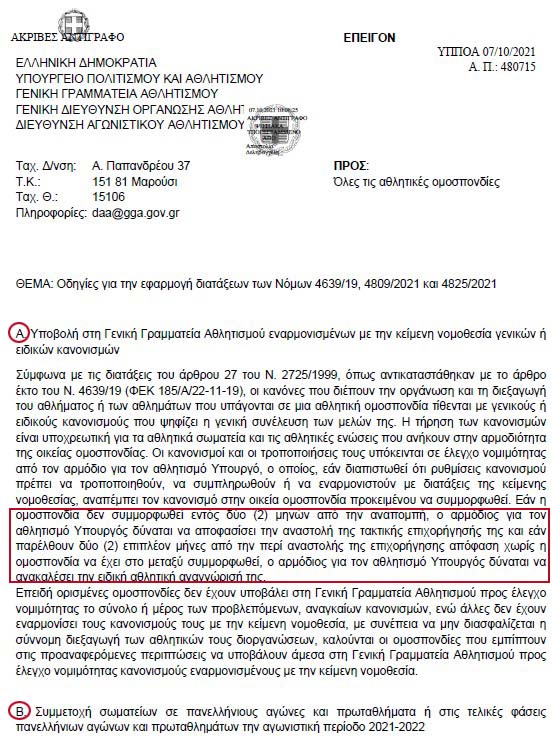 7/10/2021 - Επιθετικός, όπως πάντα, ο Αυγενάκης εξέδωσε Ερμηνευτική Εγκύκλιο (με κλικ εδώ) για όσους θα παρεξηγούσαν τις εντολές του όσον αφορά στην Ειδική Αθλητική Αναγνώριση (ΕΑΑ)! Σε εικόνες κατωτέρω: