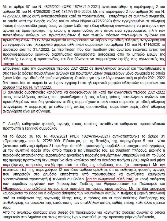 Συνεχίζει με τον αποκλεισμό των σωματείων χωρίς ΕΑΑ από τους πανελλήνιους αγώνες κατά το διάστημα ΣΕΠ 2021 έως ΙΟΥΛ 2022 και την απειλή της οριστικής διαγραφής τους από τις αθλητικές ομοσπονδίες αν δεν θα έχουν φροντίσει να πάρουν την ΕΑΑ μέχρι την 31/7/2022. Τέλος, αφήνει παράθυρα για τους δημόσιους υπαλλήλους και ταυτόχρονα προπονητές ολυμπιακών αθλημάτων, ώστε να κρατάει ικανοποιημένο τον στρατό των ψηφοφόρων της Ν.Δ. του δημοσίου!!! Το Άρθρο του Ελληνικού Συντάγματος περί του δικαιώματος των Ελλήνων ως προς το συνεταιρίζεσθαι έχει πάει περίπατο και ευθέως και πλαγίως! Το δικαίωμα των Ελλήνων στην άθληση έχει πάει και αυτό περίπατο!