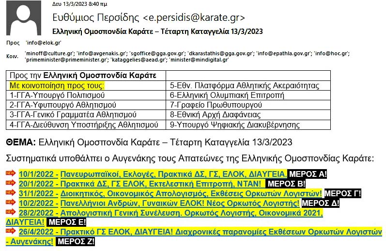 | 50 | Όταν το 2014 και κατά την εξέλιξη της Σχολής Προπονητών Καράτε "βομβάρδιζα" τα Υπουργεία με emails (κλικ εδώ) για τις παρανομίες του Γερόλυμπου σε τρεις αθλητικές ομοσπονδίες και την αδιαφορία της ΓΓΑ για αυτές τις παρανομίες (τα emails έφθαναν και στα χέρια του σημερινού Πρωθυπουργού!), η τότε κυβέρνηση του Αντώνη Σαμαρά έδωσε εντολή στον Υφυπουργό Αθλητισμού Γιάννη Ανδριανό να "καθαρίσει" τις ομοσπονδίες-μαϊμούδες με αποτέλεσμα μετά από ενδελεχείς έρευνες να αφαιρεθεί η ειδική αθλητική αναγνώριση από εννέα ομοσπονδίες (κλικ εδώ)! Αυτό δεν είχε γίνει ποτέ πριν και δεν έγινε ποτέ μετά, αλλά έγινε μόνο μια φορά στο τέλος του 2014 και αιτία ήταν οι έρευνες και δημοσιεύσεις του www.karate.gr! |