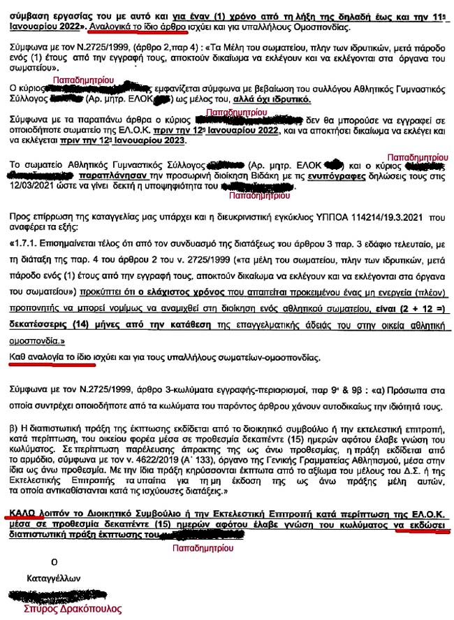 Κατόπιν τούτου είμαι υποχρεωμένος όπως αναφέρω - καταγγείλω τα κάτωθι στην εποπτεύουσα αρχή της ΕΛ.Ο.Κ, την Γ.Γ.Α και σε κάθε άλλη αρμόδια αρχή για την ως άνω απαράδεκτη πρακτική διότι η ΕΛ.Ο.Κ είναι υποχρεωμένη εκ του νόμου να δίνει αριθμό πρωτοκόλλου σε κάθε εισερχόμενο έγγραφο που λαμβάνει και να το παραδίδει άμεσα είτε εις χείρας είτε με αποστολή ηλεκτρονικού ταχυδρομείου στον αποστολέα του εγγράφου χωρίς να απαιτείται ειδική άδεια από εκτελεστικά μέλη του Δ.Σ της ΕΛ.Ο.Κ και συγκεκριμένα του Γ.Γ της ΕΛ.Ο.Κ.