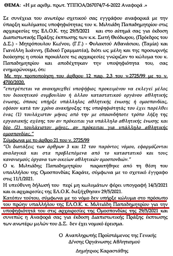 | 50 | Όταν το 2014 και κατά την εξέλιξη της Σχολής Προπονητών Καράτε "βομβάρδιζα" τα Υπουργεία με emails (κλικ εδώ) για τις παρανομίες του Γερόλυμπου σε τρεις αθλητικές ομοσπονδίες και την αδιαφορία της ΓΓΑ για αυτές τις παρανομίες (τα emails έφθαναν και στα χέρια του σημερινού Πρωθυπουργού!), η τότε κυβέρνηση του Αντώνη Σαμαρά έδωσε εντολή στον Υφυπουργό Αθλητισμού Γιάννη Ανδριανό να "καθαρίσει" τις ομοσπονδίες-μαϊμούδες με αποτέλεσμα μετά από ενδελεχείς έρευνες να αφαιρεθεί η ειδική αθλητική αναγνώριση από εννέα ομοσπονδίες (κλικ εδώ)! Αυτό δεν είχε γίνει ποτέ πριν και δεν έγινε ποτέ μετά, αλλά έγινε μόνο μια φορά στο τέλος του 2014 και αιτία ήταν οι έρευνες και δημοσιεύσεις του www.karate.gr! |