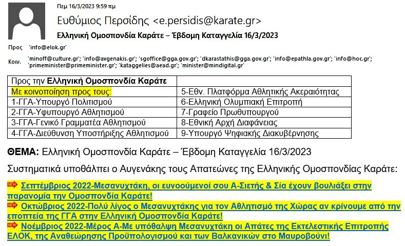 | 50 | Όταν το 2014 και κατά την εξέλιξη της Σχολής Προπονητών Καράτε "βομβάρδιζα" τα Υπουργεία με emails (κλικ εδώ) για τις παρανομίες του Γερόλυμπου σε τρεις αθλητικές ομοσπονδίες και την αδιαφορία της ΓΓΑ για αυτές τις παρανομίες (τα emails έφθαναν και στα χέρια του σημερινού Πρωθυπουργού!), η τότε κυβέρνηση του Αντώνη Σαμαρά έδωσε εντολή στον Υφυπουργό Αθλητισμού Γιάννη Ανδριανό να "καθαρίσει" τις ομοσπονδίες-μαϊμούδες με αποτέλεσμα μετά από ενδελεχείς έρευνες να αφαιρεθεί η ειδική αθλητική αναγνώριση από εννέα ομοσπονδίες (κλικ εδώ)! Αυτό δεν είχε γίνει ποτέ πριν και δεν έγινε ποτέ μετά, αλλά έγινε μόνο μια φορά στο τέλος του 2014 και αιτία ήταν οι έρευνες και δημοσιεύσεις του www.karate.gr! |