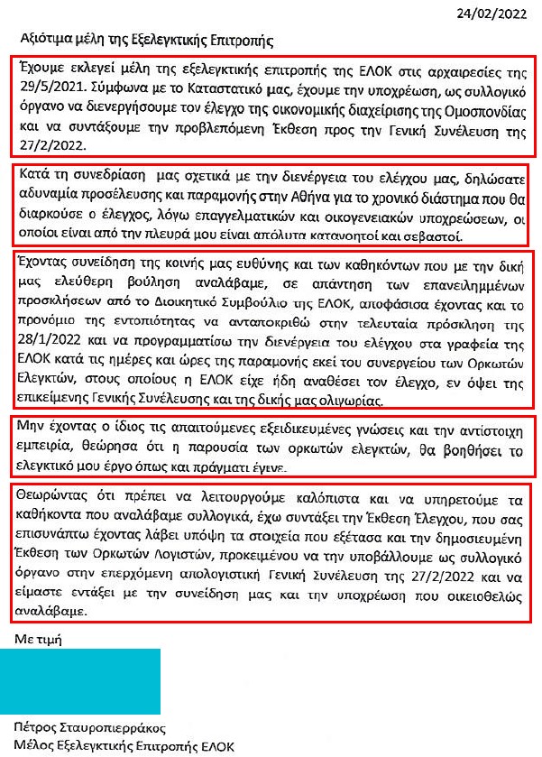 Επιστολή-Διαμαρτυρία της Ελεγκτικής Επιτροπής για εμπόδια στο έργο της από τον Ταμία και μηδενική πρόοδος στους διαχειριστικούς κα οικονομικούς ελέγχους της ΕΛΟΚ!