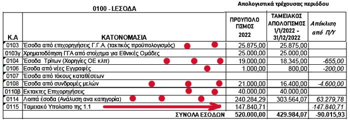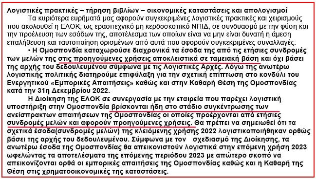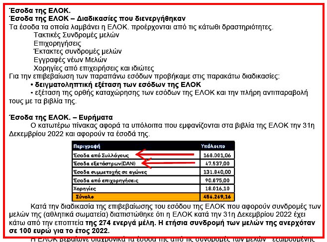 Όπως γίνεται φανερό εκ των ανωτέρω, στις 399.000 € των εσόδων της ΕΟΔΙ-ΞΕ.ΒΡΩ.ΧΡΗ. για το 2022, το άθροισμα των παράνομων εισπράξεών της είναι 30.000 + 16.000 + 50.000 + 11.000 + 71.000 + 70.000 = 248.000 € και αποτελούν οικονομικές απάτες του επόμενου ΔΣ/ΕΛΟΚ και η ΕΛΟΚ εισπράττει χρήματα με καραμπινάτες ψευδείς αιτιολογίες στα παραστατικά της: