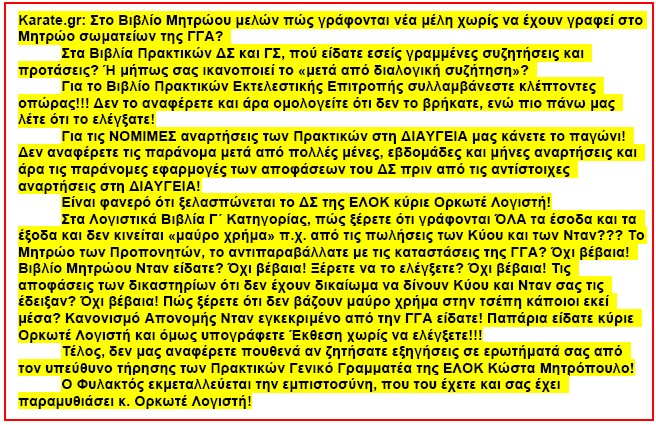 1.4 - Οι εξετάσεις Νταν των 30.000 € αποτελούν καραμπινάτη παρανομία της ΕΛΟΚ, διότι κατά ΠΡΩΤΟΝ με αυτές τις εξετάσεις και μόνο έχει εκτραπεί από το Σκοπό της και θα πρέπει να της αφαιρεθεί η Ειδική Αθλητική Αναγνώριση, διότι εξαπατούν τον κόσμο εκδίδοντας άχρηστα Νταν σε κωλόχαρτα μόνο και μόνο με πληρωμή χωρίς εξετάσεις! Κατά ΔΕΥΤΕΡΟΝ έχουμε και δεύτερη καραμπινάτη παρανομία, διότι εξετάσεις και αποτελέσματα πρέπει να γίνονται μετά από τις αντίστοιχες αποφάσεις του ΔΣ πράγμα που δεν γίνεται ΠΟΤΕ! Κατά ΤΡΙΤΟΝ, τα διπλώματα είναι απόλυτα προσωπικά και θα πρέπει να κόβονται αποδείξεις στο όνομα του κάθε εξεταζόμενου και νέου κατόχου Νταν με τα στοιχεία του και τον λόγο της παροχής υπηρεσιών και οπωσδήποτε ποτέ δεν χρεώνονται τα σωματεία!! Πώς εισπράττει τα λεφτά ο Μαφιόζος Ταμίας Θανάσης Φυλακτός??? Το πιθανότερο κατά ΤΕΤΑΡΤΟΝ είναι να τα εισπράττει με αποδείξεις στο όνομα συλλόγων και όχι ατόμων και με αιτιολογικό "οικονομική ενίσχυση για τους σκοπούς της ομοσπονδίας", πράγμα που σημαίνει ότι πάει σούμπιτος ΚΟΡΥΔΑΛΛΟ!!!
