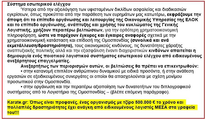Εδώ σαφέστατα, ο Ορκωτός, αποποιείται της ευθύνης των οικονομικών καταστάσεων, πράγμα που καθιστά την Έκθεσή του τελείως άχρηστη για την επικύρωσή της από τη Γενική Συνέλευση και την απαλλαγή του ΔΣ από πάσης ευθύνης!!! Συνεπώς, ο Διαχειριστικός και Οικονομικός Έλεγχος της ΕΛΟΚ παραμένει αίολος, απόλυτα αστήρικτος και αθεμελίωτος!