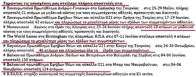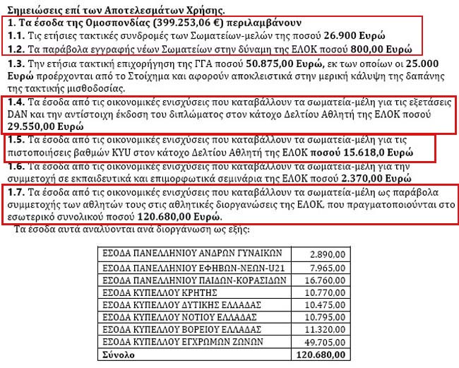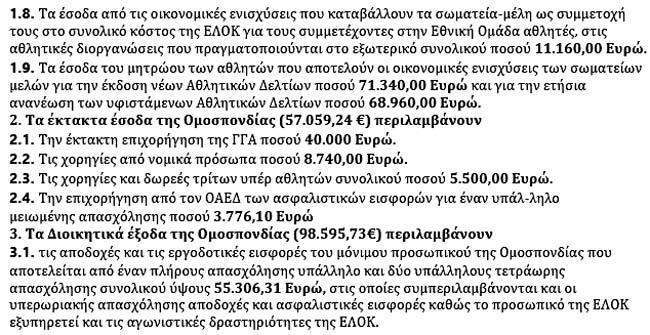 1.8 - Τα έσοδα 11.000 € δήθεν οικονομικών ενισχύσεων των συλλόγων για συμμετοχές των αθλητών τους στις εθνικές ομάδες είναι επίσης μια απάτη της ΕΛΟΚ, διότι στην πραγματικότητα τα λεφτά αυτά τα πληρώνουν οι γονείς των αθλητών και όχι οι σύλλογοι, οι οποίοι αν τα πλήρωναν θα είχαν κλείσει μια ώρα νωρίτερα! Συνεπώς εκδίδονται ψευδείς και εικονικές αποδείξεις!