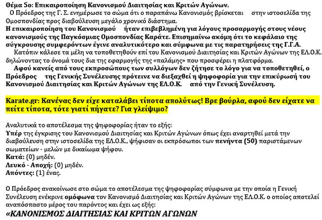 Για τα μέλη του ΔΣ υπάρχει μεταξύ άλλων και ο περιορισμός να μην είναι προπονητές καράτε, ώστε να μην προκύπτει η λεγόμενη "σύγκρουση συμφερόντων"!