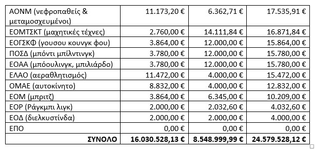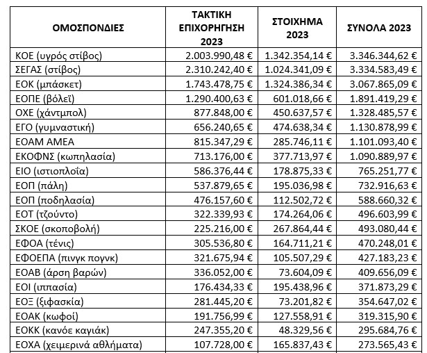 * 16.030.528,13€ ως Τακτική Επιχορήγηση 2023 των Ομοσπονδιών (τους έχουν ήδη καταβληθεί η α΄ δόση, ύψους 7.740.000€)