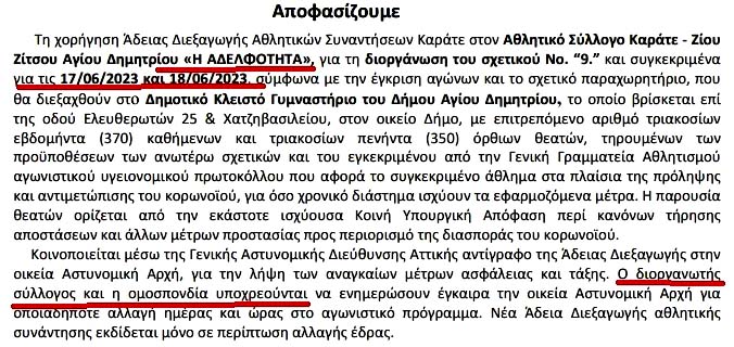 3 - Στην άδεια του Δήμου Αγίου Δημητρίου αναφέρεται ότι ο διοργανωτής είναι μόνο ο σύλλογος "Η Αδελφότητα", ενώ στην Προκήρυξη αναφέρονται σαφώς ότι ΔΥΟ είναι οι διοργανωτές σύλογοι: η Αδελφότητα και οι Λέοντες της Νέας Σμύρνης! Πάντα όμως υπο την αιγίδα του ... "Ταρζάν από τα Πετράλωνα", που είναι η ΕΛΟΚ του Λαμόγιου Α-Σιετή για να πείθονται οι χοντροκέφαλοι των Δήμων!