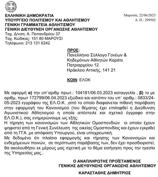 "23/6/2023 - Οι καταγγελίες του Συλλόγου Γονέων Αθλητών Καράτε στα χέρια της