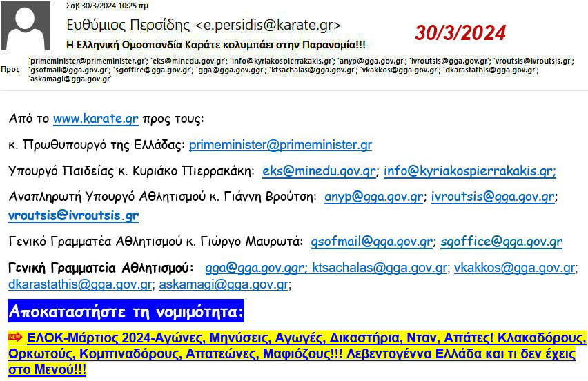 Από την 1/3/2023 καταγγέλθηκαν αναδρομικά από την 29/5/2021 όλες οι παρανομίες του Διοικητικού Συμβουλίου της ΕΛΟΚ σε όλες τις αρμόδιες υπηρεσίες με emails, ώστε να μην λένε ότι δεν ξέρουν! Οι καταγγγελίες επαναλαμβάνονται μετά την ανάληψη των υπουργείων από τη νέα κυβέρνηση! |