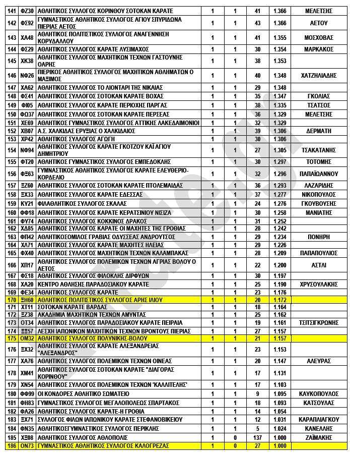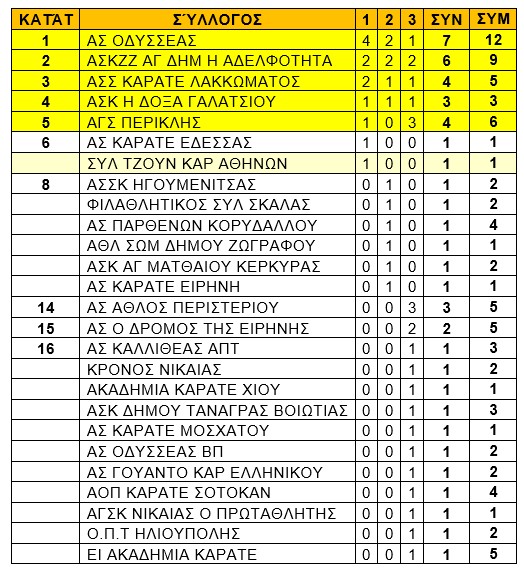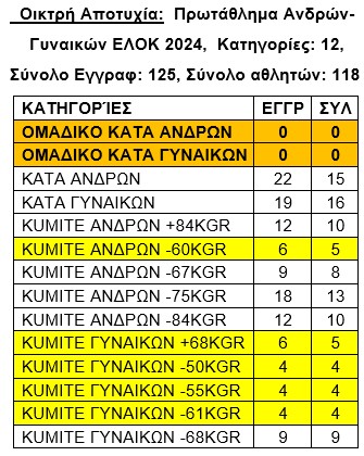 Σε Πίνακα οι 12 Κατηγορίες του Πανελλήνιου Πρωταθλήματος, όπου οι πορτοκαλί Κατηγορίες ούτε που αναφέρθηκαν, ενώ στις κίτρινες οι αθλητές ήταν τόσο λίγοι, που ... πήραν σχεδόν όλοι μετάλλια: