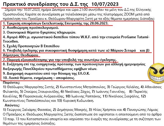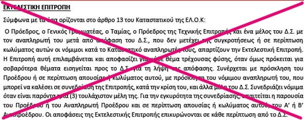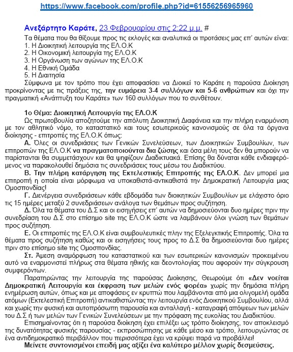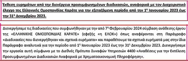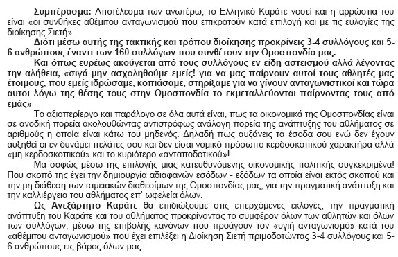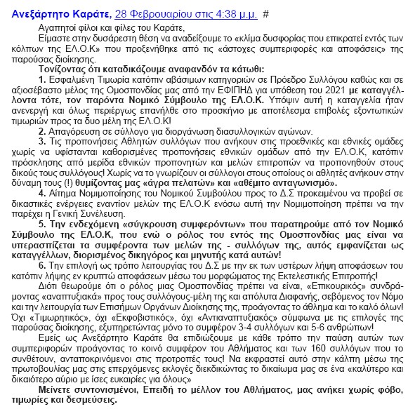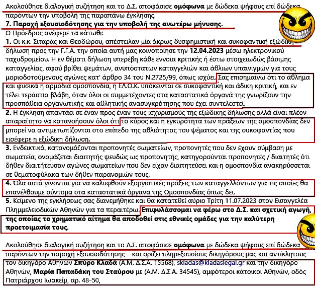 2. Το ίδιο παρατηρούμε να πραγματοποιεί πολλάκις και για άλλες δικαστικές περιπέτειες που έχει εμπλέξει την Ομοσπονδία μας για «προσωπικές τους υποθέσεις» που δεν αφορούν την ΕΛ.Ο.Κ, αλλά «τις χρεώνουν οι ίδιοι στην ομοσπονδία μας» χωρίς να έχουν λάβει ουδεμία νομιμοποίηση από τη Γενική Συνέλευση!