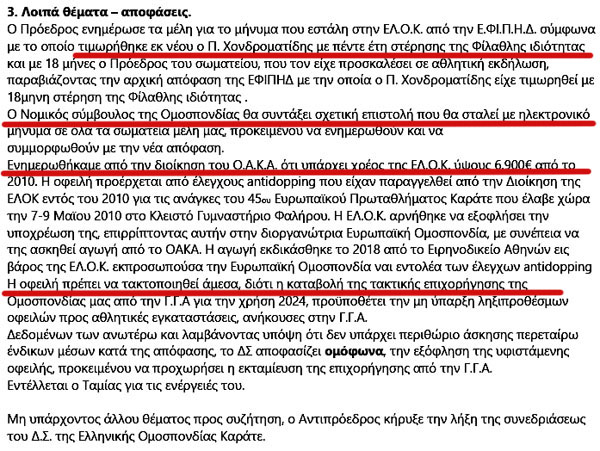 5. Το 2024 κίνησε επαναφορά καταγγελίας στην ΕΦΙΠΗΔ την οποία είχε πραγματοποιήσει το 2021, ο νομικός σύμβουλος της ΕΛΟΚ σήμερα, η οποία ήταν στα «συρτάρια της ΕΦΙΠΗΔ» προκειμένου να τιμωρηθεί ο κ. Χονδροματίδης (δάσκαλος) και ένας πρόεδρος συλλόγου…Οπως και τιμωρήθηκε μετά την αδράνεια που επέδειξε η ΕΦΙΠΗΔ από το 2021 έως και σήμερα με 5 χρόνια ο πρώτος και 16 μήνες ο δεύτερος (πως να το κρίνουμε αυτό…ειλικρινά δεν ξέρω). Διότι ο κ. Χονδροματίδης εξέφρασε την πρόθεση του να ασκήσει αντιπολίτευση και να κατέβει στις εκλογές απέναντι στην διοίκηση Σιετή!