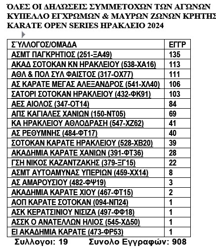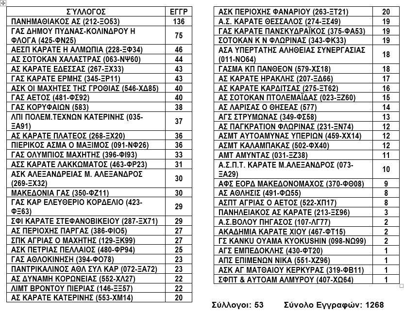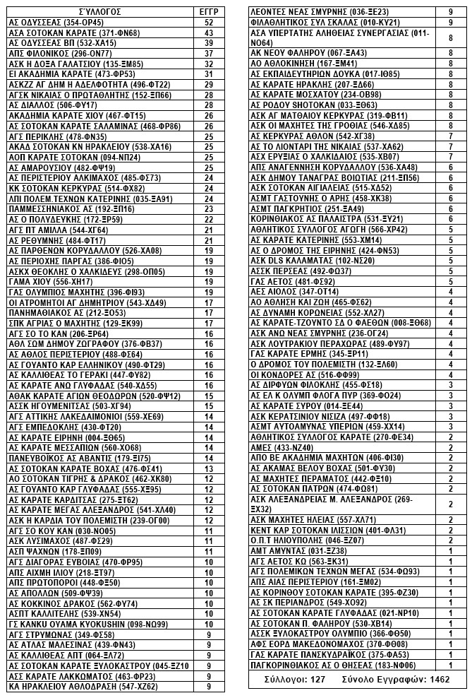 Ακολουθεί ο Πίνακας των συμμετοχών των συλλόγων κατά φθίνουσα σειρά:
