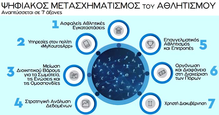 «Μέσα από ένα πλέγμα χρηστικών ψηφιακών εργαλείων, ο πολίτης θα έχει πρόσβαση στο σύνολο των στοιχείων του Αθλητισμού (ομοσπονδίες, σωματεία, αθλητές, προπονητές), ενώ θα μειωθεί η γραφειοκρατία, με την απλοποίηση των διαδικασιών πιστοποίησης και αδειοδότησης αθλητικών φορέων και εγκαταστάσεων.