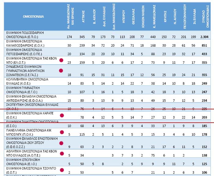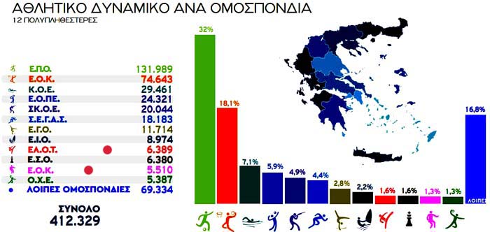 * Η Ελληνική Ποδοσφαιρική Ομοσπονδία διαθέτει τα περισσότερα σωματεία και το μεγαλύτερο ποσοστό (32%) αθλητικού δυναμικού µε 131.989 αθλητές.