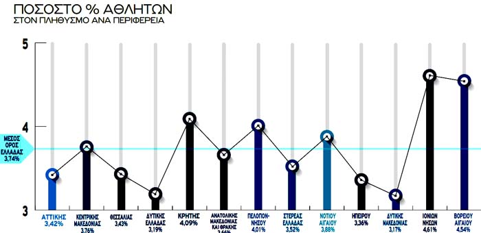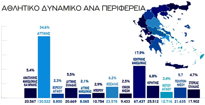 * Η Αττική είναι η περιφέρεια µε το μεγαλύτερο ποσοστό αθλητικού δυναμικού (34,6%) και η Δυτική Μακεδονία µε το μικρότερο ποσοστό (2,1%), ενώ την ίδια στιγμή η περιφέρεια µε μεγαλύτερο ποσοστό αθλητικού δυναμικού ανά πληθυσμό είναι η Περιφέρεια Ιονίων Νήσων µε 4,59%!