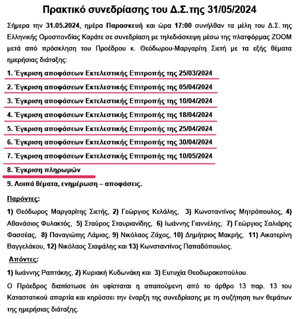 Στο πρώτο από αυτά, της 31/5/2024, όπως βλέπουμε πιο κάτω περιέχει πληθώρα αποφάσεων της παράνομης Εκτελεστικής Επιτροπής, οι οποίες πλασάρονται ως αποφάσεις του ΔΣ χωρίς αυτές ποτέ να αναρτώνται στη ΔΙΑΥΓΕΙΑ! Μιλάμε για το απόλυτο αθλητικό έγκλημα!!!