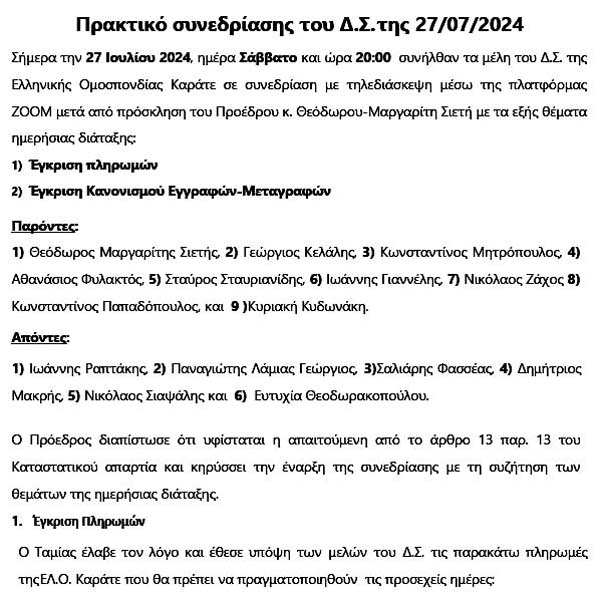 Μη υπάρχοντος άλλου θέματος προς συζήτηση, ο Πρόεδρος κήρυξε τη λήξη της συνεδριάσεως του Δ.Σ. της Ελληνικής Ομοσπονδίας Καράτε. Για το Διοικητικό Συμβούλιο Ο Πρόεδρος Θεόδωρος - Μαργαρίτης Σιετής Ο Γενικός Γραμματέας Κώστας Μητρόπουλος Τα μέλη: Γιώργος Κελάλης, Γιώργος Σαλιάρης – Φασσέας, Θανάσης Φυλακτός, Νίκος Ζάχος, Σταύρος Σταυριανίδης, Γιάννης Γιαννέλης, Ιωάννης Ραπτάκης, Νικόλαος Σιαψάλης, Παναγιώτης Λάμιας, Ευτυχία Θεοδωρακοπούλου, Δημήτριος Μακρής, Κων. Παπαδόπουλος, Κυριακή Κυδωνάκη |