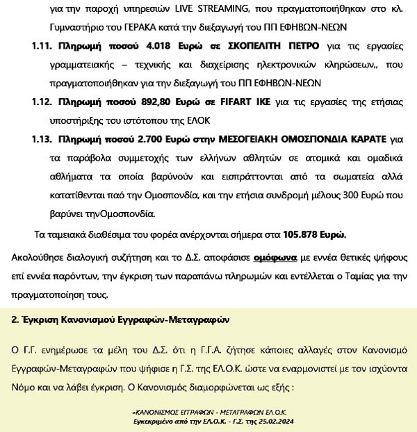 Στο δεύτερο από αυτά, της 27/7/2024, όπως βλέπουμε πιο κάτω και αναρτήθηκε τέσσερις μήνες αργότερα στη ΔΙΑΥΓΕΙΑ, περιέχει πληθώρα παράνομων πληρωμών του παράνομου Ταμεία Θανάση Φυλακτού, αλλά κυρίως περιέχει το ΝΕΟ Κανονισμό Μεταγραφών της ΕΛΟΚ, που τον εφάρμοσαν άμεσα από την επόμενη ημέρα της συνεδρίασης, με τον οποίο πιθανώς τιμώρησαν το σύλλογο της αντιπολίτευσης του Τάσου Πανουσόπουλου (να το δουν οι δικηγόροι του), του αφαίρεσαν το δικαίωμα ψήφου και τον πιθανό υποψήφιό του για τις εκλογές και άρα αυτό αποτελεί λόγο ακύρωσης των εκλογών της ΕΛΟΚ!