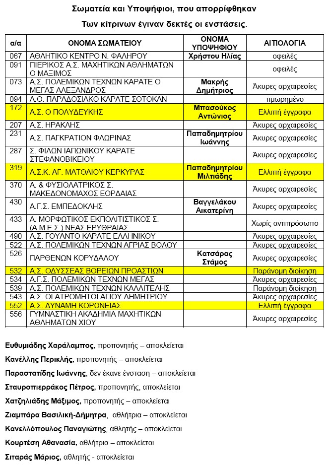 Με βάση τα ως άνω προκύπτει αδιστάκτως ότι οι προσβαλλόμενες αποφάσεις του ΔΣ της ΕΛΟΚ καθό μέρος αποφάσισαν τον αποκλεισμό των 14ου, 15ου και 16ου των αιτούντων πάσχουν ακυρότητα προεχόντως γιατί δεν βρίσκουν έρεισμα στο νόμο , καθόσον παραβιάζουν την διάταξη του άρθρου 2 παράγραφος 4 του Ν.2725/1999 και την διάταξη του άρθρου 3 παρ.3 ν. 2725/1999.