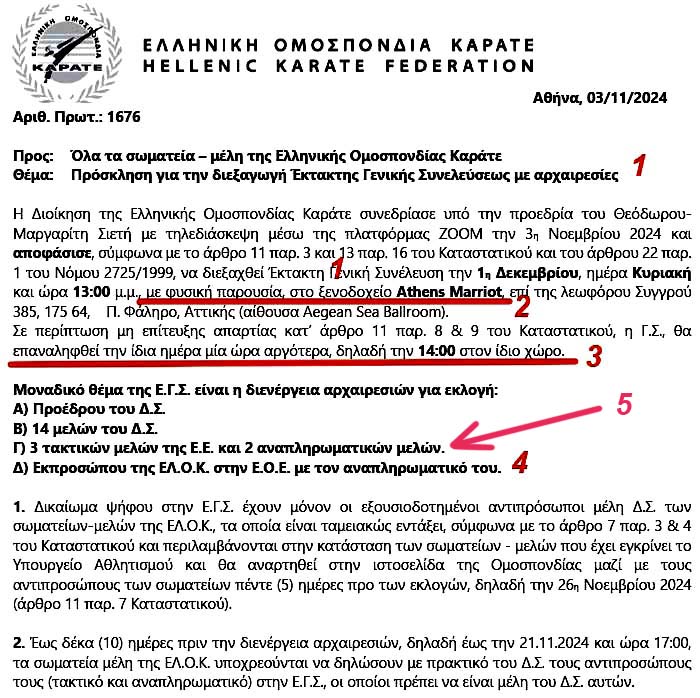 Σχόλιο-1: Είναι άθλιο, παράνομο και αποτελεί κατάφωρη προσπάθεια ΑΙΦΝΙΔΙΑΣΜΟΥ ΚΑΙ ΧΕΙΡΑΓΩΓΗΣΗΣ να συγκαλείται ΕΚΤΑΚΤΗ Γενική Συνέλευση για Αρχαιρεσίες σε αθλητική ομοσπονδία σε 27 ημέρες από την Πρόσκληση και ΟΧΙ ΤΑΚΤΙΚΗ ΣΕ 45 ημέρες από την Πρόσκληση!!! Γιατί ΕΚΤΑΚΤΗ, αφού από την ημέρα που ανέλαβαν στις 30/5/2021 γνώριζαν οι Μαφιόζοι, που διοικούν την ΕΛΟΚ, ότι στο τέλος του Ολυμπιακού έτους 2024 θα έπρεπε να γίνουν βάσει του αθλητικού νόμου οι εκλογές για ΔΣ κτλ. Η ΓΣ για τις Εκλογές της ΕΛΟΚ βάσει του νόμου θα έπρεπε να είναι ΤΑΚΤΙΚΗ και οι σύλλογοι, όπως και οι επιθυμούντες θα θέσουν υποψηφιότητες, θα έπρεπε να έχουν 45 ημέρες να προετοιμαστούν! Αυτή η καραμπινάτη προσπάθεια ΑΙΦΝΙΔΙΑΣΜΟΥ ΚΑΙ ΧΕΙΡΑΓΩΓΗΣΗΣ των υποψηφιοτήτων και των αποτελεσμάτων των εκλογών από τους Μαφιόζους, που διοικούν, και τον δικηγόρο τους αποτελεί έναν πρώτο καραμπινάτο λόγο ακύρωσης και της Πρόσκλησης πριν από την 1/12/2024 και της Γενικής Συνέλευσης μετά την 1/12/2024!