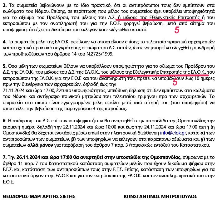 Σχόλιο-5: Εξετάζοντας πλέον σήμερα εκ των υστέρων τις εκλογές της ΕΛΟΚ βλέπουμε ότι στην Πρόσκληση τονίζεται δεόντως (και καλώς) η επιδίωξη εκλογής και μελών της Εξελεγκτικής Επιτροπής πράγμα στο οποίο θα επανέλθουμε, διότι για την Εξελεγκτική Επιτροπή ΔΕΝ ΥΠΗΡΞΕ ΟΥΔΕΜΙΑ ΥΠΟΨΗΦΙΟΤΗΤΑ και τελικά δεν έγινε εκλογή μελών της! Και αυτό αποτελεί τον τέταρτο καραμπινάτο λόγο ακύρωσης της Γενικής Συνέλευσης Αρχαιρεσιών!