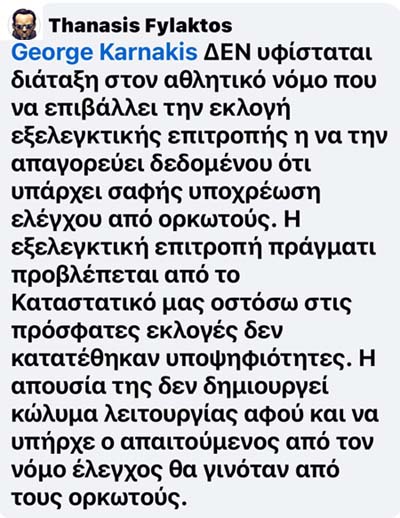 Γ. Αποφάσισε ότι δεν έχουμε δικαίωμα συμμετοχής στην Έκτακτη Γενική Συνέλευση οι προτεινόμενοι ως υποψήφιοι 17η, 18ος και 19ος εξ ημών εκ των οποίων μάλιστα ο τελευταίος Μάριος Σιταράς είμαι υποψήφιος Πρόεδρος. Ο αποκλεισμός μας έγινε κατ’ επίκληση του άρθρου 3 παράγραφος 5 του Ν.2725/1999 σύμφωνα με το οποίο: «αθλητής μπορεί να εγγραφεί ως μέλος σε αθλητικό σωματείο, σύμφωνα με τους όρους και τις προϋποθέσεις του καταστατικού του, ένα (1) τουλάχιστον έτος μετά την τελευταία συμμετοχή του σε επίσημο αθλητικό αγώνα.».