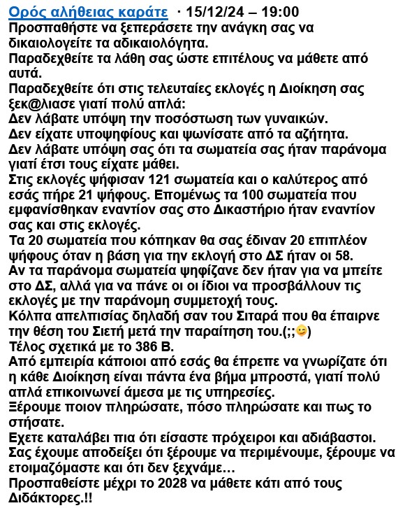 Τι λέτε επ' αυτού κύριε Πρωθυπουργέ, που ευνοείτε τη διοίκηση της ομοσπονδίας Καράτε από τους Τρεις Μαφιόζους? Βλέπετε κάπου στο Πρακτικό τις αποφάσεις του ΔΣ να αναρτώνται στη ΔΙΑΥΓΕΙΑ να μας τις δείξετε να τις δούμε και εμείς (?), διότι ΕΓΩ ΔΕΝ ΤΙΣ ΒΛΕΠΩ ΠΟΥΘΕΝΑ!!!