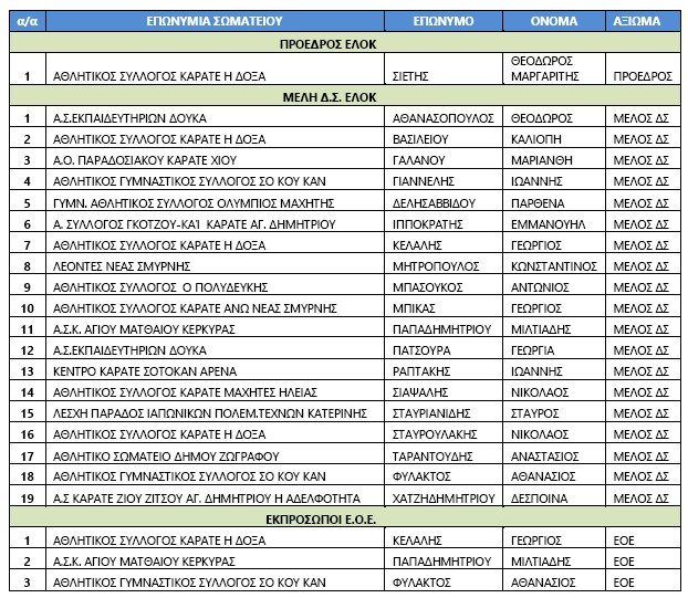 ΔΣ της ΕΛΟΚ: • Πρόεδρος: ΘΕΟΔΩΡΟΣ ΜΑΡΓΑΡΙΤΗΣ ΣΙΕΤΗΣ • Αναπληρωτής Πρόεδρος: ΓΕΩΡΓΙΟΣ ΜΠΙΚΑΣ • Γενικός Γραμματέας: ΚΩΝΣΤΑΝΤΙΝΟΣ ΜΗΤΡΟΠΟΥΛΟΣ • Ταμίας: ΑΘΑΝΑΣΙΟΣ ΦΥΛΑΚΤΟΣ • Πρόεδρος Τεχνικής Επιτροπής: ΣΤΑΥΡΟΣ ΣΤΑΥΡΙΑΝΙΔΗΣ • Ειδικός Γραμματέας: ΙΩΑΝΝΗΣ ΓΙΑΝΝΕΛΗΣ • Έφορος Υλικού: ΑΝΤΩΝΙΟΣ ΜΠΑΣΟΥΚΟΣ • Μέλη: ΓΕΩΡΓΙΟΣ ΚΕΛΑΛΗΣ, ΕΜΜΑΝΟΥΗΛ ΙΠΠΟΚΡΑΤΗΣ, ΚΑΛΛΙΟΠΗ ΒΑΣΙΛΕΙΟΥ, ΜΑΡΙΑΝΘΗ ΓΑΛΑΝΟΥ, ΘΕΟΔΩΡΟΣ ΑΘΑΝΑΣΟΠΟΥΛΟΣ, ΔΕΣΠΟΙΝΑ ΧΑΤΖΗΔΗΜΗΤΡΙΟΥ, ΠΑΡΘΕΝΑ ΔΕΛΗΣΑΒΒΙΔΟΥ και ΓΕΩΡΓΙΑ ΠΑΤΣΟΥΡΑ. • Αντιπρόσωπος Προπονητών: ΚΩΝ/ΝΟΣ ΠΑΠΑΔΟΠΟΥΛΟΣ • Αναπληρωτής Αντιπρόσωπος Προπονητών: ΚΩΝ. ΓΚΟΥΒΟΥΣΗΣ • Αντιπρόσωπος Αθλητών: ΚΥΡΙΑΚΗ ΚΥΔΩΝΑΚΗ • Αναπληρωτής Αντιπρόσωπος Αθλητών: Κ. ΜΑΣΤΡΟΓΙΑΝΝΗΣ