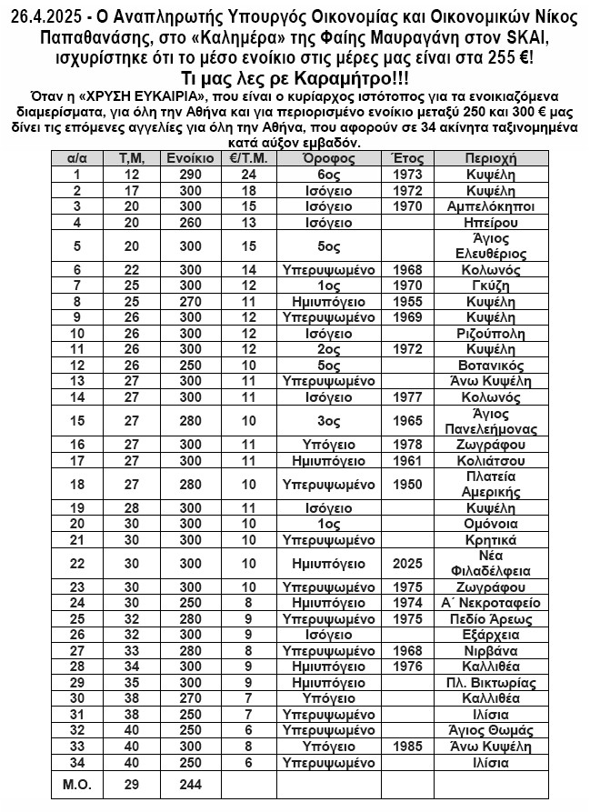 26.4.2025 - Ο Αναπληρωτής Υπουργός Οικονομίας και Οικονομικών Νίκος Παπαθανάσης, στο «Καλημέρα» της Φαίης Μαυραγάνη στον SKAI, ισχυρίστηκε θρασύτατα ότι το μέσο ενοίκιο στις μέρες μας είναι στα 255 €, πράγμα απόλυτα ψευδές! Τι μας λέτε ρε Καραμήτροι!!!.