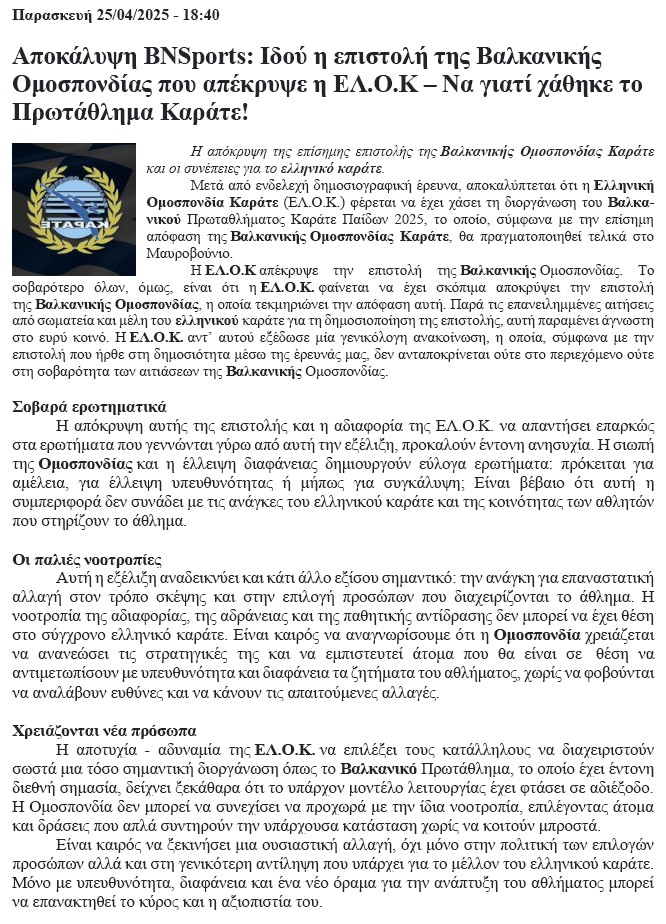 Η Ελληνική Ομοσπονδία Καράτε (ΕΛΟΚ) από το 1995 και ο "Οίκος της Μεγάλης Ανοχής" (ΓΓΑ !!!) κατρακυλάνε από εκλογές σε εκλογές στην κατηφόρα σφιχταγκαλιασμένοι με τις παρανομίες, τις αποτυχίες και τις αρπαχτές τους καταστρέφοντας το άθλημα του Καράτε, αλλά και γενικότερα τον Αθλητισμό!