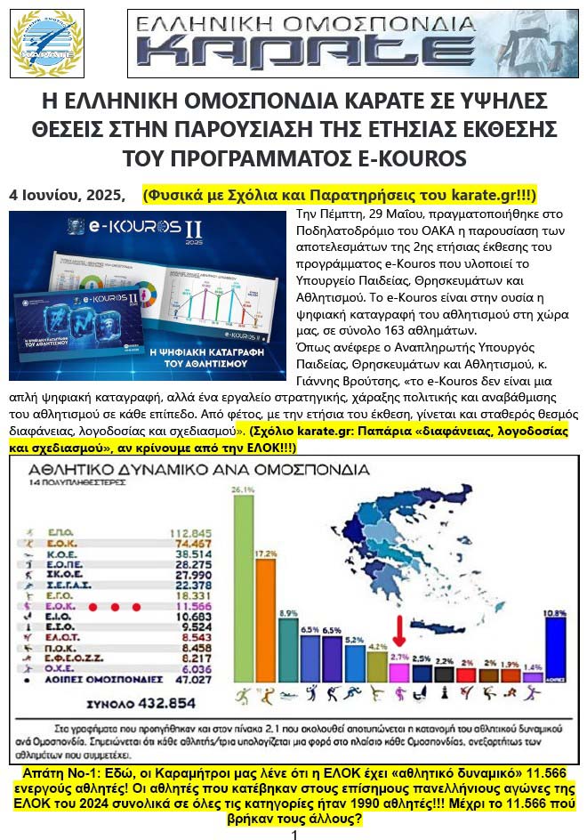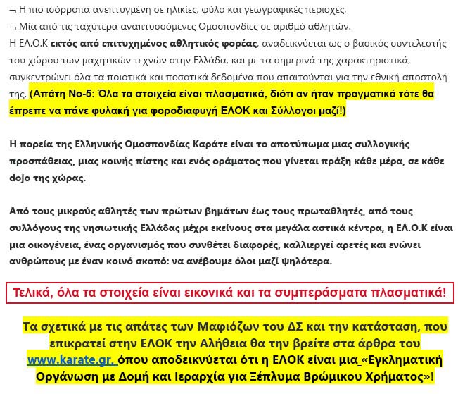 Η Ελληνική Ομοσπονδία Καράτε (ΕΛΟΚ) από το 1995 και ο "Οίκος της Μεγάλης Ανοχής" (ΓΓΑ !!!) κατρακυλάνε από εκλογές σε εκλογές στην κατηφόρα σφιχταγκαλιασμένοι με τις παρανομίες, τις αποτυχίες και τις αρπαχτές τους καταστρέφοντας το άθλημα του Καράτε, αλλά και γενικότερα τον Αθλητισμό!