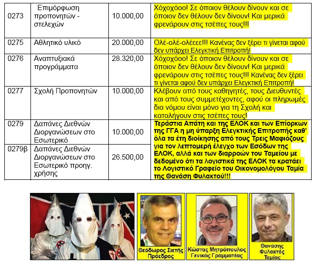 Αλλά υπάρχει και κάτι πολύ χειρότερο από αυτό: Τα Πρακτικά που αναρτούν στη ΔΙΑΥΓΕΙΑ οι Τρεις Μαφιόζοι και τα Τσιράκια τους, όποτε και αν τα αναρτούν, ΔΕΝ ανταποκρίνονται στην πραγματικότητα και ΔΕΝ πληρούν το νόμο περί ΔΙΑΥΓΕΙΑΣ, διότι ΔΕΝ αναγράφονται όλες οι πραγματικές αποφάσεις του ΔΣ, αλλά αποκρύπτονται με την καραμπινάτη κομπίνα των Τριών Μαφιόζων του δήθεν "Εγκρίνονται οι Αποφάσεις της Εκτελεστικής Επιτροπής", οι οποίες ποτέ ΔΕΝ αναγράφονται πουθενά! Μιλάμε για καραμπινάτη ΑΛΗΤΕΙΑ διάρκειας 4,5 χρόνων με τους επίορκους της Γενικής Γραμματείας Αθλητισμού να ... ξύνονται παρά τις επί 4,5 χρόνια καταγγελίες μας!!!
