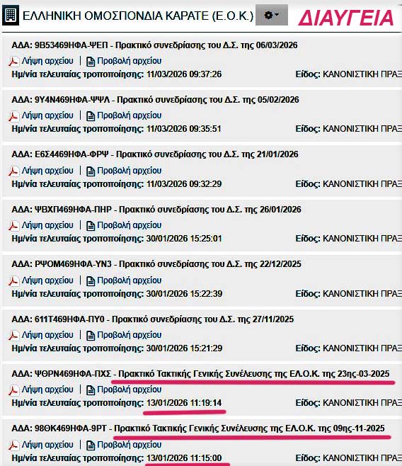 Από ότι βλέπετε από το άνω στιγμιότυπο της 19/3/2026, στη ΔΙΑΥΓΕΙΑ έχει αναρτηθεί το Πρακτικό της Γενικής Συνέλευσης της ΕΛΟΚ της 23ης-03-2026 την 13/01/2026, δηλαδή με καθυστέρηση 8 μηνών, μαζί με το Πρακτικό της Γενικής Συνέλευσης της ΕΛΟΚ της 9ης-11-2026 (με καθυστέρηση 2 μηνών), πράγμα που σημαίνει ότι κανένα Πρακτικό δεν είναι οριστικοποιημένο ποτέ και πάντα όλα υπόκεινται σε τροποποιήσεις πλαστογραφίας από τους αθλητικούς εγκληματίες της ΕΛΟΚ.ΕΠΕ! Αυτά γίνονται από την αρχή της ισχύος του νόμου περί ΔΙΑΥΓΕΙΑΣ το 2010! Ομοσπονδία μπουρδέλο, Γενική Γραμματεία Αθλητισμού μπουρδέλο, Κράτος ... μαντέψτε!!!