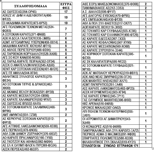 Οι συμμετοχές των συλλόγων κατά σειρά πλήθους αθλητών! Από εδώ και τα θλιβερά συμπεράσματα για την Ανάπτυξη του νέου φρούτου! Του Μπασούκου, του Μπουλούκου, του Μπουρδούκου??? Να μας εξηγήσει ο κύριος σε μια διοργάνωση της Ομοσπονδίας με 20 παρακαλώ κατηγορίες πώς δικαιολογεί τους 31 συλλόγους-μέλη της ομοσπονδίας με συμμετοχή ΕΝΟΣ αθλητή??? Να μας εξηγήσει ο Καραμήτρος (!!!) πώς εξηγεί τις συμμετοχές 19 συλλόγων-μελών της ομοσπονδίας με 2 και 3 αθλητές σε 20 κατηγορίες??? Δεν θα βρίσκετε θύμα να κλέψετε στο τέλος!!! ΑΝΙΚΑΝΟΙ!!!