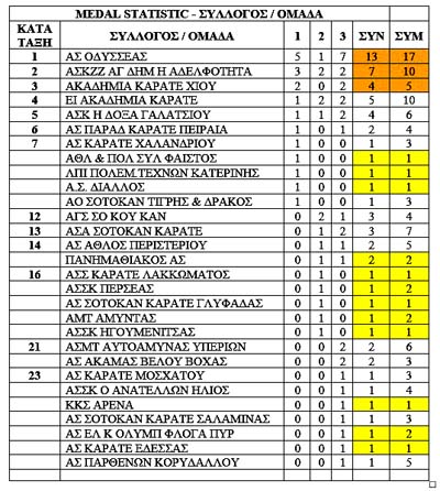 Τέλος, ο επόμενος Πίνακας Μεταλλίων με την προσθήκη και των Συμμετοχών των συλλόγων αποδεικνύει ότι μόνο οι πολύ καλοί αθλητές που έχουν πιθανότητες για μετάλλιο κατεβαίνουν στους αγώνες, πράγμα που αποδεικνύει ότι το άθλημα έχει περιέλθει σε μεγάλη απαξία με υπαιτιότητα πάντα του Διοικητικού Συμβουλίου και των Τεχνικών ή καλύτερα των Τριών Μαφιόζως που διοικούν το άθλημα και απομυζούν την Ομοσπονδία!!! Του υπενθυμίζουμε κάτω από τον Πίνακα Μεταλλίων για να μην τους ξεχνάτε!!!