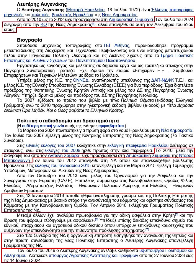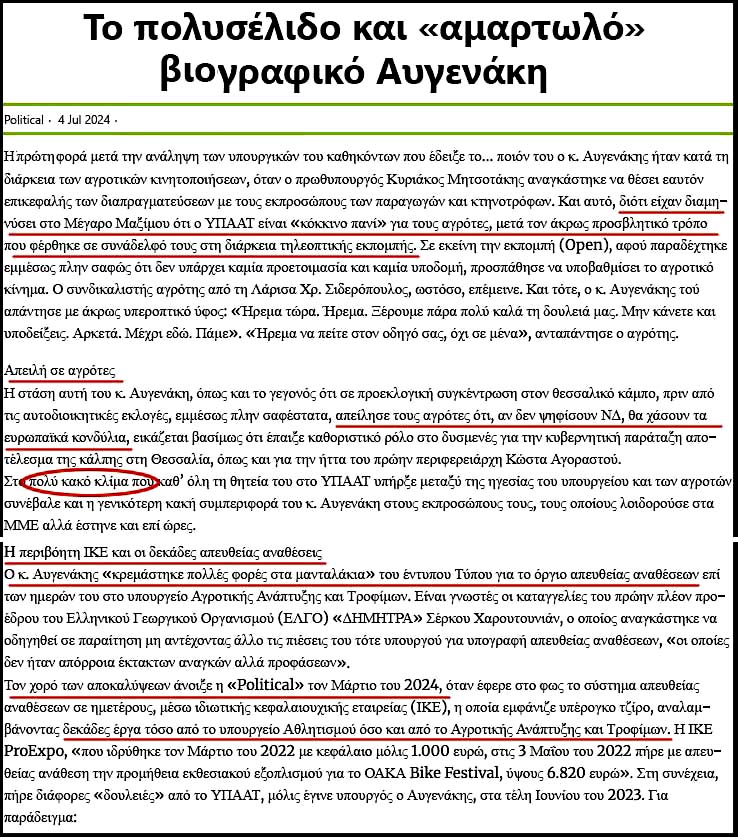 Παραθέτουμε κατωτέρω το Βιογραφικό του Αυγενάκη από το διαδίκτυο και μερικά άρθρα σχετικά με την πορεία του "ιδανικού" αυτού πολιτικού μας, τα οποία προφανέστατα αποδεικνύουν ότι ο Λευτέρης Αυγενάκης ήταν ένα υπερδραστήριο και προβεβλημένο χωρίς φραγμούς μέλος της Νέας Δημοκρατίας από τα "δεξιά χέρια" του Πρωθυπουργού!