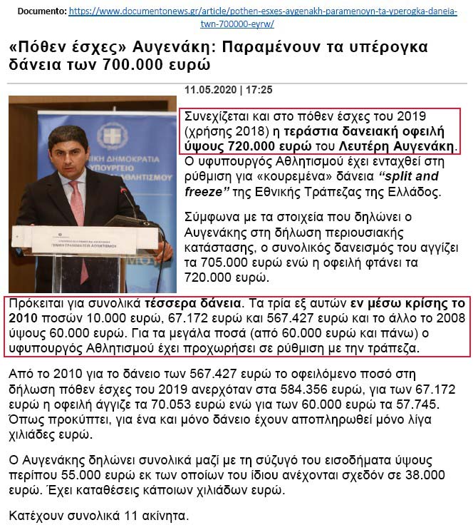 Όταν ο Αυγενάκης ανέλαβε τη ΓΓΑ έψαξα για το Πόθεν Έσχες του και βρήκα ότι είχε δανειστεί από την ΕΘΝΙΚΗ ΤΡΑΠΕΖΑ κάπου 950.000 το 2009 (?), πράγμα που μου έκανε μεγάλη εντύπωση, διότι από ότι είδα στην ακίνητη περιουσία του δεν είχε τις απαιτούμενες εγγυήσεις για ένα τόσο μεγάλο δάνειο!