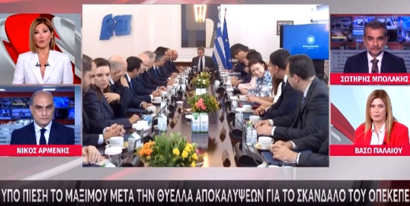 «Να δούμε τις εξελίξεις. Είμαστε ήδη συνδεδεμένοι με τον Νίκο Αρμένη, τον Σωτήρη Μπολάκη, τη Βάσω Παλαιού την Κατερίνα Νόντα και τον Γιάννη Ρήγο. Ξεκινάμε το δελτίο μας από τις ραγδαίες εξελίξεις στο σκάνδαλο του ΟΠΕΚΕΠΕ.